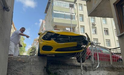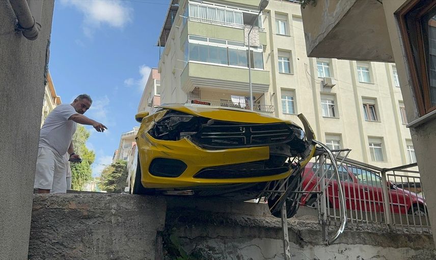 Küçükçekmece'de freninin tutmaması sonucu kontrolden çıkan taksi, iki bina arasındaki duvarda asılı kaldı.