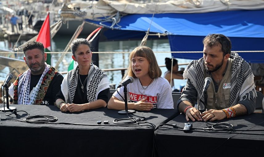 Filistin ile dayanışma ve İsrail'in ablukasını kırmak için 44'ten fazla ülkenin desteğiyle Küresel Sumud Filosu (Global Sumud Flotilla) adıyla oluşturulan uluslararası sivil yardım filosuna bağlı tekneler İspanya'nın Barselona kentinden Gazze'ye doğru yola çıktı. Barselona Limanı'nın ardından İtalya, Yunanistan ve Tunus'tan Akdeniz'e yelken açacak olan, 20 kadar tekne ve 300'den fazla kişinin olduğu Küresel Sumud Filosunda aktivist, sanatçı, politikacı, doktor ve gazeteciler yer aldı. Barselona limanındaki teknelerin yola çıkmasından önce basın toplantısı düzenlendi. Basın toplantısında, İsveçli aktivist Greta Thunberg (sağ 2), 'Küresel Sumud Filosu' (Global Sumud Flotilla) adlı girişimin sözcüsü Saif Abukeshek (solda) ve aktivist Yasemin Acar (sol 2) da konuşma yaptı.