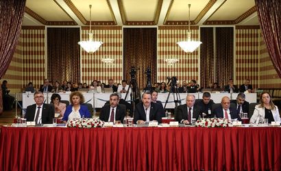 "Terörsüz Türkiye" hedefi doğrultusunda TBMM'de kurulan Milli Dayanışma, Kardeşlik ve Demokrasi Komisyonu, TBMM Başkanı Numan Kurtulmuş'un başkanlığında toplandı. TBMM Tören Salonu'nda düzenlenen komisyonun 8. toplantısına, Memur-Sen Genel Başkanı Ali Yalçın (sol 4), Türkiye Kamu-Sen Genel Başkanı Önder Kahveci (sol 3), KESK Eş Genel başkanları Ayfer Koçak (sol 2) ve Ahmet Karagöz (solda), TÜRK-İŞ Genel Başkan Yardımcısı Ramazan Ağar (sağ 3), HAK-İŞ Genel Başkanı Mahmut Arslan (sağ 2), DİSK Genel Başkanı Arzu Çerkezoğlu (sağda) da katıldı.
