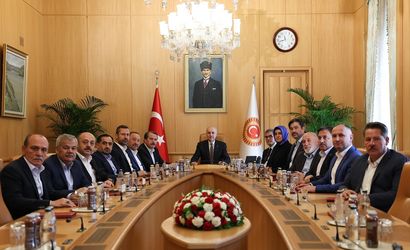 Türkiye Büyük Millet Meclisi Başkanı Numan Kurtulmuş (ortada), Memur Sendikaları Konfederasyonu (Memur-Sen) Genel Başkanı Ali Yalçın (sol 6) ve Memur-Sen'e bağlı sendikaların genel başkanlarını kabul etti.