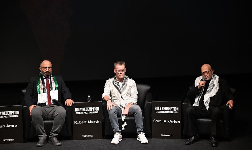 Çekimleri TRT World ekipleri tarafından işgal altındaki Filistin topraklarında gerçekleştirilen, Yahudi yerleşimcilerin Batı Şeria'da Filistinlilere karşı vahşetini anlatan "Kutsal İşgal" (Holy Redemption) belgeselinin gösterimi öncesi düzenlenen panelde Gazze'de barış ve ateşkesin önündeki engeller ele alındı. Atlas Sineması'nda gerçekleştirilen "İsrail'in işgali, dünya çapında bir ahlak krizini nasıl tetikledi? Barış ve ateşkesin önündeki engeller" başlıklı ilk panelde Filistinli aktivist Issa Amro (solda), Avustralyalı aktivist ve tarihçi Robert Martin (ortada) ve Filistinli düşünür Prof. Dr. Sami al-Arian (sağda) konuşma yaptı.