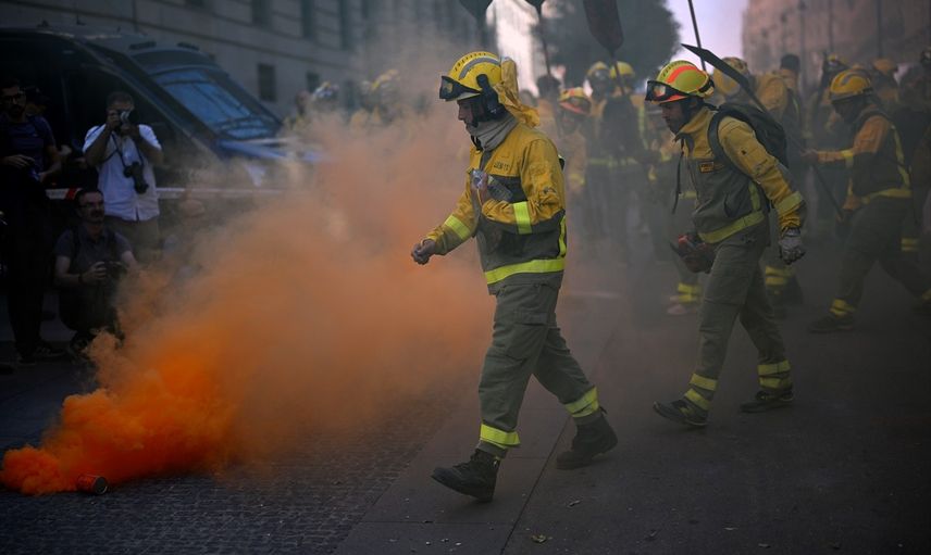 İspanya'nın başkenti Madrid'de süresiz grevde olan orman itfaiyecileri seslerini duyurmak için Maliye Bakanlığı binası önünde protesto düzenledi. Maaş zammı ve çalışma şartlarının iyileştirilmesi talebiyle resmi kıyafetleriyle eyleme gelen itfaiyeciler, meşalelerle ateş ve duman çıkararak, yere vurdukları kazma ve kürekleriyle protestolarını gerçekleştirdi.