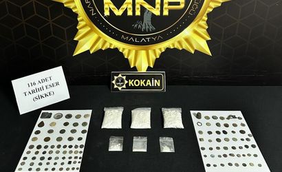 Bir iş yeri ile bir şüphelinin üzerinde yapılan aramalarda 167 gram kokain ve 116 adet tarihi eser niteliğinde sikke ele geçirildi.