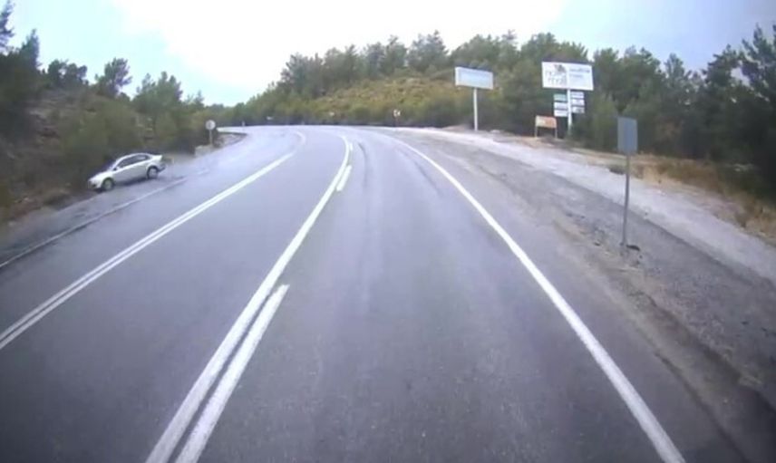 Kaza anı, karşı yönden gelen başka bir otomobilin araç kamerasına saniye saniye yansıdı. Görüntülerde, süratli bir şekilde viraja giren otomobilin yağışla ıslanan zeminde kayarak yol kenarındaki yağmur suyu tahliye kanalına çarptığı ve takla attığı görülüyor.