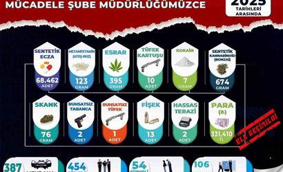 Operasyonlarda ele geçirilenler arasında: 68 bin 492 sentetik ecza (hap), 503 gram sentetik kannabinoid (bonzai), 395 gram esrar, 171 gram sentetik kannabinoid (bonzai) hammaddesi, 123 gram metamfetamin, 76 gram skank, 7 gram kokain, 2 ruhsatsız tabanca, 13 fişek, 1 ruhsatsız tüfek, 10 tüfek kartuşu, 2 hassas terazi ve uyuşturucu madde ticaretinden elde edildiği değerlendirilen 331 bin 410 TL para yer aldı.
