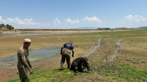 Manisa'da katırlarını kurtarmaya çalışan şahıs, bataklığa saplanarak ekipler tarafından kurtarıldı.