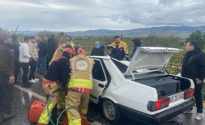 Manisa'nın Alaşehir ilçesinde meydana gelen trafik kazasında, otomobilin kamyona ve bariyerlere çarpması sonucunda 5 kişi yaralandı.