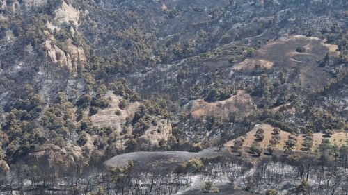 Manisa'nın Akhisar ve Ahmetli ilçelerinde meydana gelen orman yangınlarında zarar gören alanlar dronla görüntülendi.