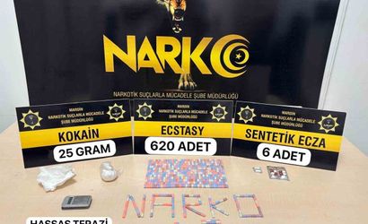 Operasyonda 620 adet ecstasy hap, 25 gram kokain, 6 adet sentetik ecza ve 1 hassas terazi ele geçirildi. Ele geçirilen maddelere el konuldu.