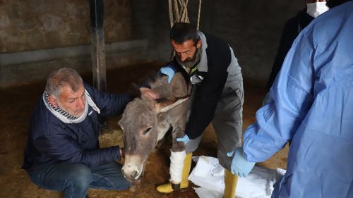 Mardin'de kazada ayağı kırılan eşeğe, rehabilitasyon merkezinde protez takıldı. Eşeğin tedavi süreci başlatıldı.