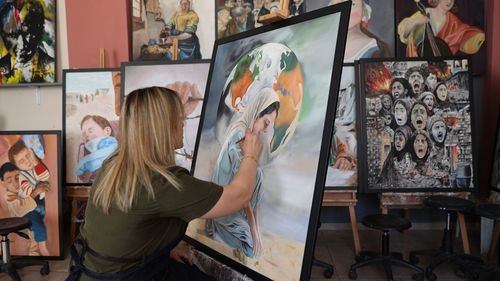 Mardin Güzel Sanatlar Lisesi öğretmeni Esengül Bozdağ Alan, 20 yıldır atölyesinde resimleriyle savaş ve göç mağduru kadınların sesini duyurmaya çalışıyor.