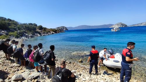 Muğla'nın Marmaris ilçesinde bir koyda, 13 düzensiz göçmen ve 2 göçmen kaçakçısı yakalandı.