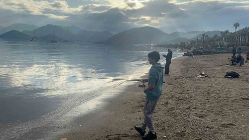 Muğla'nın Marmaris ilçesinde sağanak sonrası güneş açtı; sahiller doldu, amatör balıkçılar kefal umuduyla oltalarını denize attı.