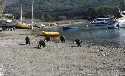 Muğla'nın Marmaris ilçesinde aç kaldıkları için şehre inen yaban domuzları sahilde bir süre yiyecek aradı. Adaköy Mahallesi'nde yaban domuzları, Yalancıboğaz mevkisindeki sahile indi.