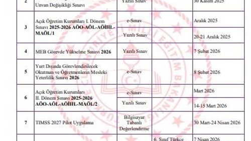 Milli Eğitim Bakanlığı 2026 sınav takvimini yayımladı. LGS 14 Haziran 2026, İOKBS 26 Nisan 2026'da yapılacak; açık öğretim, izleme ve e-Sınav tarihleri takvimde yer alıyor.
