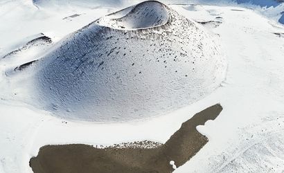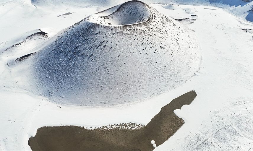 Konya'nın Karapınar ilçesinde, jeolojik miras niteliğindeki Meke Gölü, kar yağışının ardından beyaz örtüyle kaplandı.