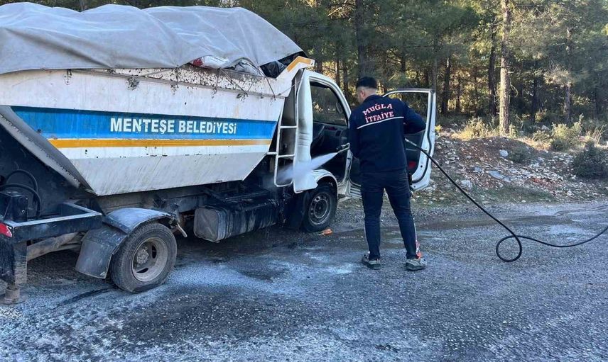 Muğla’nın Menteşe ilçesinde, Menteşe Belediyesi’ne ait çöp kamyoneti, Katı Atık Depolama Tesisi yolunda seyir halindeyken motor kısmından alev aldı.