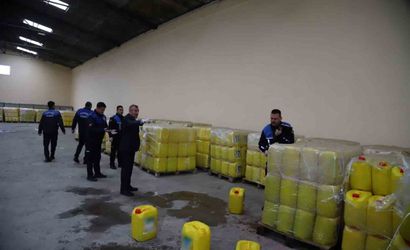 MERSİN'DE BİR DEPOYA DÜZENLENEN OPERASYONDA, YURT DIŞINA 'AYÇİÇEĞİ YAĞI' DİYE SATILMAK ÜZERE HAZIRLANAN 3 BİN 650 ADET 20 LİTRELİK SU VE YAĞ KARIŞIMI DOLU BİDON ELE GEÇİRİLDİ