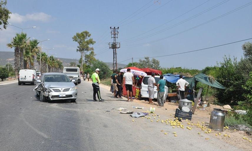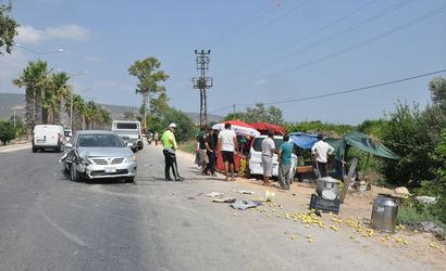 Mersin'in Silifke ilçesinde park halindeki hafif ticari araca çarpan otomobilin sürücüsü kaçtı. İki aracın da hasar gördüğü kazanın etkisiyle yol kenarında meyve sebze satışı yapılan tezgahları devirdi.