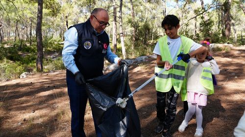 Erdemli'de 'Doğa Müfettişleri' projesiyle 11 yaşındaki Aras Kayretli ve kreş öğrencileri ormanlık alanda çöp topladı; atıklar Sıfır Atık Müdürlüğü'ne gönderildi.