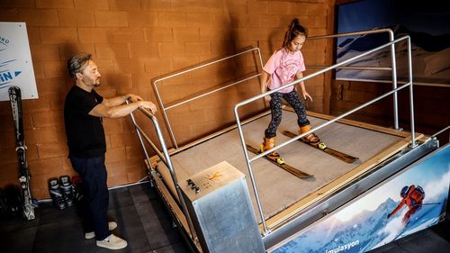 Mersin'de mühendis Gökalp Bulut, kızı için yarattığı kayak simülasyonu ile salon ortamında kayak eğitimi veriyor.