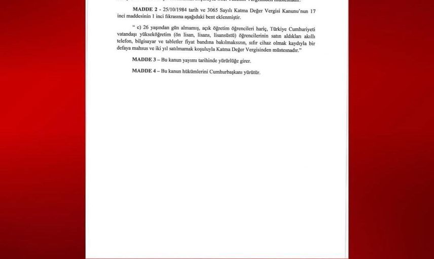 "Cumhur İttifakı olarak daha önce üniversite öğrencisi olan genç kardeşlerimiz için cep telefonu, tablet ve bilgisayar almaları halinde belirli şartlarla kendilerine tanınan vergi indirimini hayata geçirmiştik. TBMM’ye sunduğumuz yeni kanun teklifimiz ile yine üniversite öğrencisi genç kardeşlerimizin alacakları elektronik cihazlarda herhangi bir kısıtlama olmaksızın, yani fiyatlarına ve menşeine bakılmaksızın ve iki yıl kullanmaları şartıyla Özel Tüketim Vergisi’nden tamamen muaf tutulmalarına dair kanun teklifimizi meclise sunduk. Teklifimizin kanunlaşması için MHP olarak gayretimizi sürdüreceğiz."