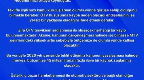 MHP Genel Başkanvekili İsmail Özdemir, TBMM’ye sundukları ÖTV teşviki teklifinin 2026'da bütçeye 45 milyar liradan fazla katkı sağlayacağını açıkladı.