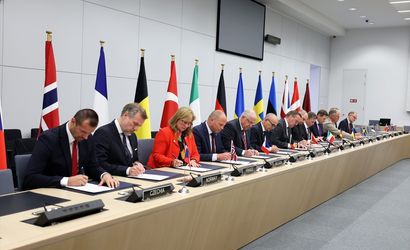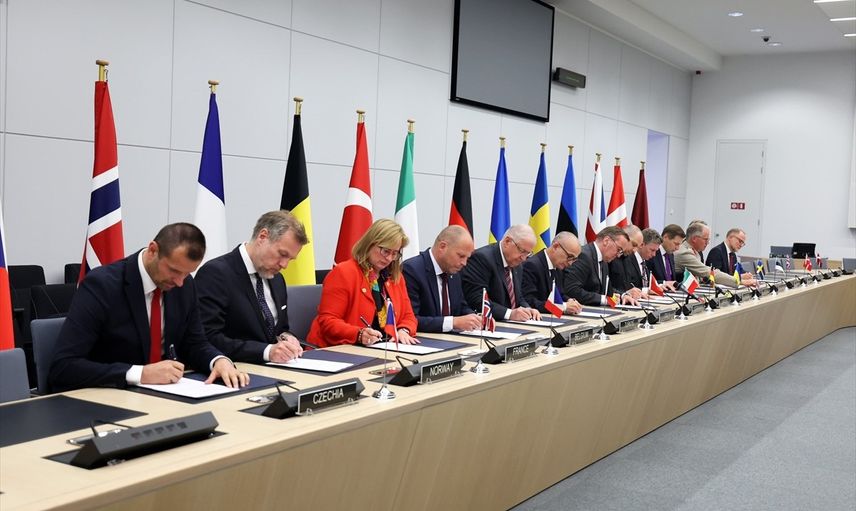Milli Savunma Bakanı Yaşar Güler (sol 2), NATO Savunma Bakanları Toplantısı kapsamında düzenlenen "Elektromanyetik Harp Koalisyonu Niyet Mektubu İmza Töreni"nde Türkiye adına mektubu imzaladı.