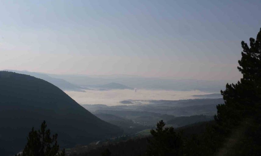 Abant Gölü Milli Parkı'nın yüksek kesimlerinden kaydedilen fotoğraflarda, sisin içinden yükselen dağlar ve ilçenin silueti adeta kartpostallık manzaralar oluşturdu.