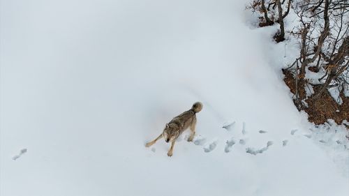 Tunceli'deki Munzur Vadisi Milli Parkı'nda, karla kaplı ormanlarda yiyecek arayan kurtlar dronla görüntülendi.