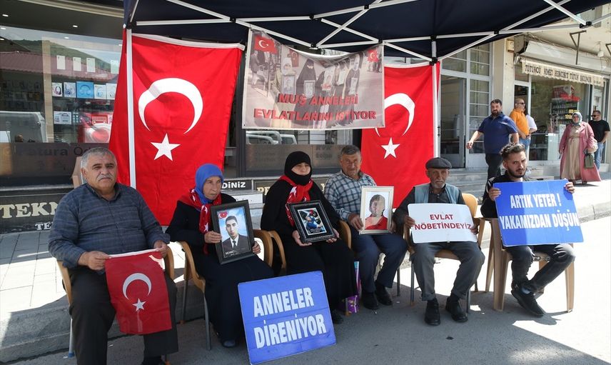 Muş'ta çocukları terör örgütü PKK tarafından kaçırılan aileler, DEM Parti İl Başkanlığı binası önünde eylemlerine devam ediyor. Her hafta çarşamba günü bir araya gelen aileler, çocuklarına "teslim ol" çağrısında bulunuyor.