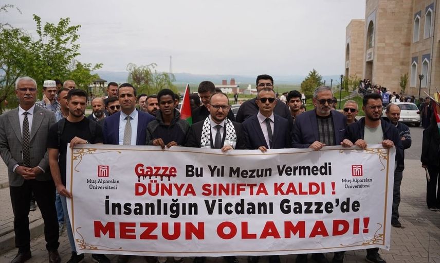Muş Alparslan Üniversitesi'nde eğitim gören öğrenciler, İsrail'in Gazze'ye yönelik saldırılarını protesto etmek amacıyla bir yürüyüş gerçekleştirdi.