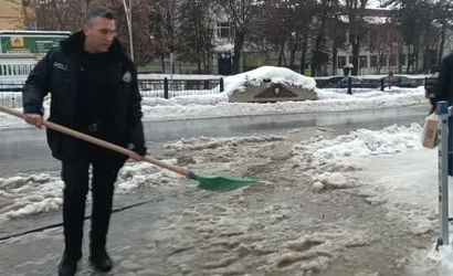 Yoğun kar sonrası oluşan su birikintilerini polis memuru kürekle temizledi