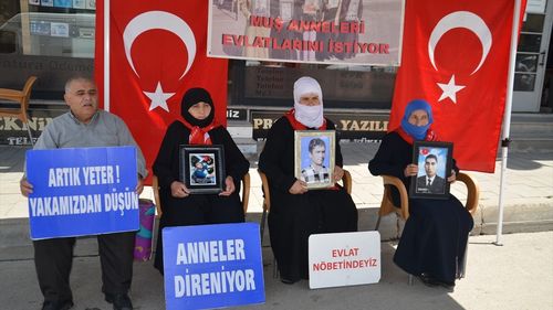 Muş'ta, çocuklarının PKK tarafından dağa götürülmesini protesto eden aileler, DEM Parti önündeki eylemlerini sürdürüyor.