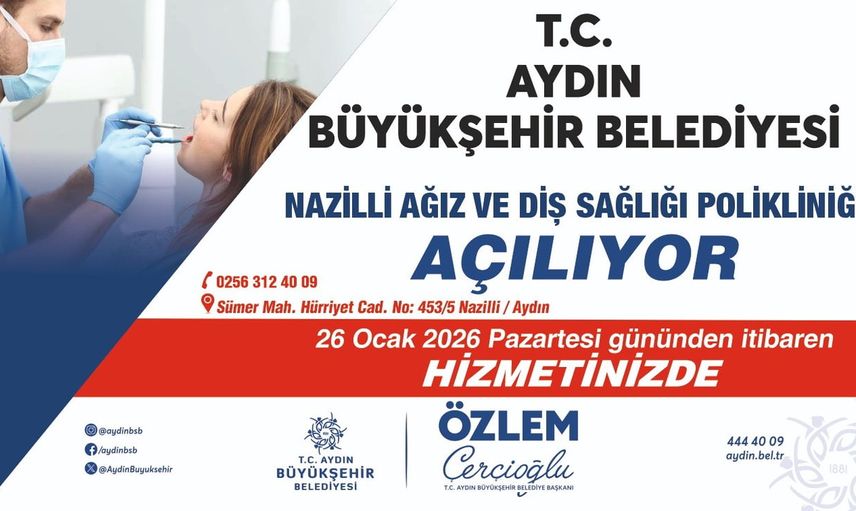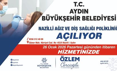 AYDIN BÜYÜKŞEHİR BELEDİYE BAŞKANI ÖZLEM ÇERÇİOĞLU'NUN KENT GENELİNDE HAYATA GEÇİRDİĞİ SAĞLIK YATIRIMLARINA BİR YENİSİ DAHA EKLENİYOR. BAŞKAN ÇERÇİOĞLU'NUN ÖNCÜLÜĞÜNDE KENTE KAZANDIRILAN NAZİLLİ AĞIZ VE DİŞ SAĞLIĞI POLİKLİNİĞİ, HİZMETE AÇILIYOR. MODERN MİMARİSİ, GÜÇLÜ TEKNİK ALTYAPISI VE VATANDAŞLARIN İHTİYAÇLARI GÖZETİLEREK PLANLANAN YAPISIYLA DİKKAT ÇEKEN POLİKLİNİĞİN AÇILIŞI, CUMHURBAŞKANI SAYIN RECEP TAYYİP ERDOĞAN'IN AYDIN'DA GERÇEKLEŞTİRECEĞİ TOPLU AÇILIŞ TÖRENİ KAPSAMINDA 24 OCAK CUMARTESİ GÜNÜ YAPILACAK.