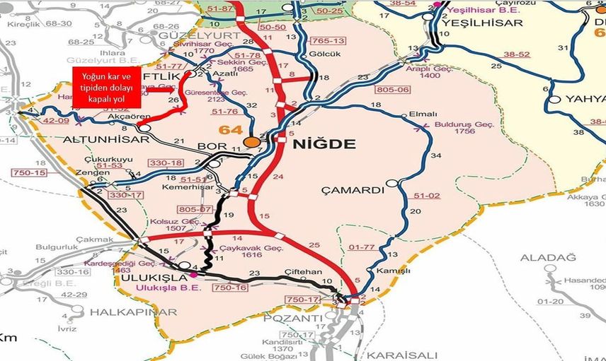 Açıklamaya göre, Niğde-Çiftlik yolunun 8 ile 30'uncu kilometreleri arasındaki bölüm ile Çiftlik-Altunhisar yolunun 32 ile 56'ncı kilometreleri arası, vatandaşların can ve mal güvenliğinin sağlanması amacıyla 12 Ocak 2026 saat 23.30 itibarıyla geçici olarak trafiğe kapatıldı.
