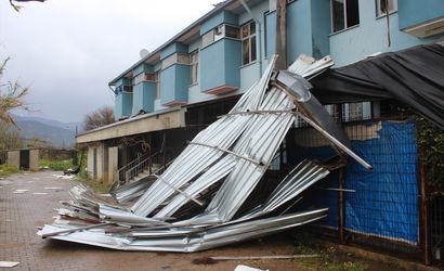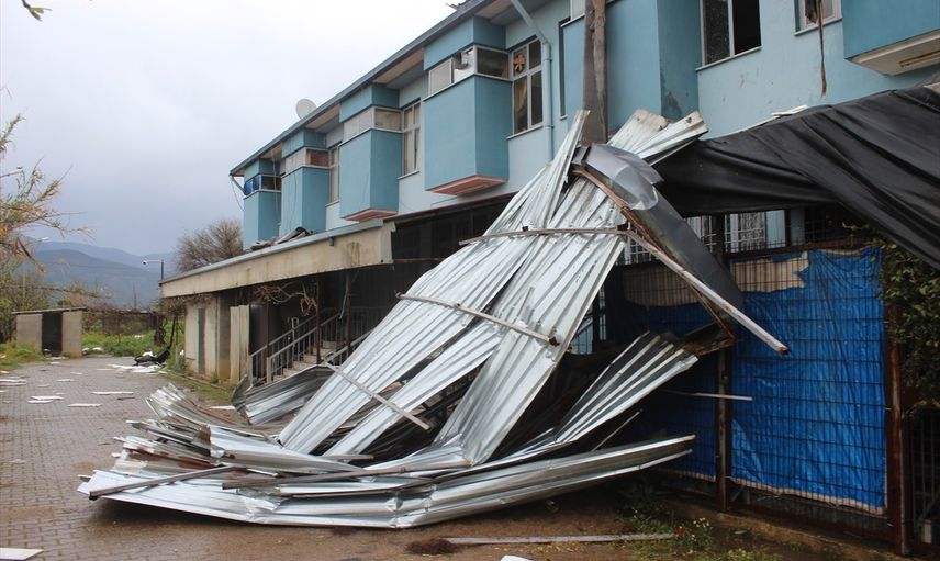 İzmir'in Ödemiş ilçesinde etkili olan sağanak ve fırtına Ayakkabıcılar Sitesi'ndeki bazı iş yerlerinin çatılarının uçmasına neden oldu.