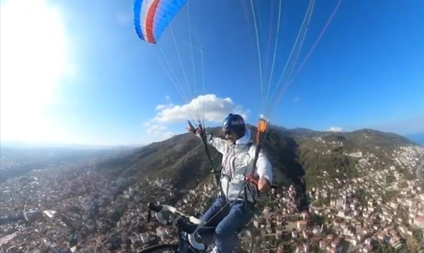 Ordu'da yamaç paraşütü sporuyla ilgilenen Durmuş Şahin, şehrin tanıtımına katkı sunmak ve bisiklet tutkusunu farklı şekilde deneyimlemek için havada bisikletiyle pedal çevirmenin heyecanını yaşadı.
