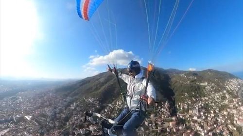 Ordu'da Durmuş Şahin, yamaç paraşütü yaparken bisiklet sürerek iki tutkusu arasında eşsiz bir deneyim yaşadı.