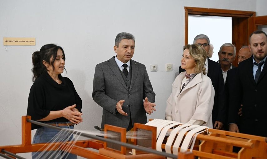Törenin ardından Vali Hulusi Şahin ve eşi Ebru Şahin, İbradı’nın köklü kültürünü yaşatan bez ayağı dokuma, geleneksel el dokuması ve çarpana dokuma gibi birçok dokuma türünün öğretildiği Halk Eğitim Merkezi Yöresel Bez Dokuma Kursunu ziyaret etti. Ziyarette, kurs kapsamında yürütülen çalışmalar ve üretilen yöresel ürünler hakkında bilgi aldı.