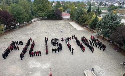 Okul bahçesinde bir araya gelen 100 öğrenci, koordineli hareketlerle Filistin yazısını oluşturarak Gazze'deki insani dram ve Filistin halkına olan desteklerini gösterdi.