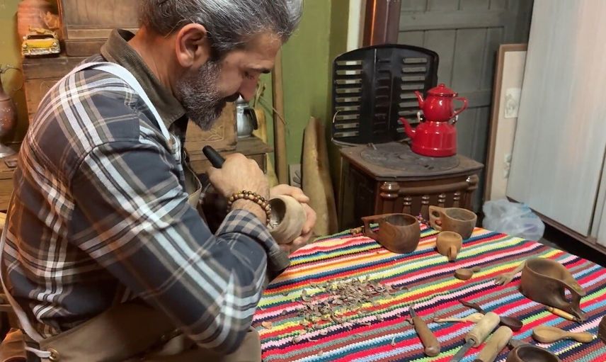 "Burası doğup büyüdüğümüz evdi ve atıl duruma düştü. Sonra atıl durumda olması benim hatıralarımdan dolayı biraz üzdü ve burayı biraz değiştirmek, güzelleştirmek istedim. Burayı güzelleştireyim derken zaten var olan eşyaların da çok kıymetli olduğunu, hatıralarım olduğunu düşündüğüm için böyle sergileyerek bu hale getirdim. Bu hale getirdikten sonra burada bir şeylerle uğraşmam gerekiyordu. Bir şeylerle uğraşayım derken dağcılık sporuna bayağı bir ilgili ve meraklı olduğum için kendime ahşaptan bir bardak yapabilir miyim diye düşündüm. Bu bardağı yapayım derken denemelerimde çok başarılı olduğumu söylediler ve bardaktan çok isteyen arkadaşlarım olduğu için böyle devam etti, gelişti ve şu anda ahşap bardak, ahşap kaşık, küçük dekorasyon gibi, dekoratif ürünler gibi şeylerle zaman geçiriyorum ve çok keyif alıyorum"