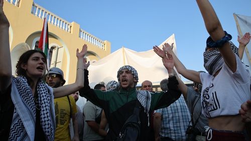 Pire Limanı'nda yüzlerce Filistin destekçisi, İsrail yolcu gemisindeki kişilerin karaya çıkmasını engellemek amacıyla gösteri düzenledi; eylem olaysız sona erdi.