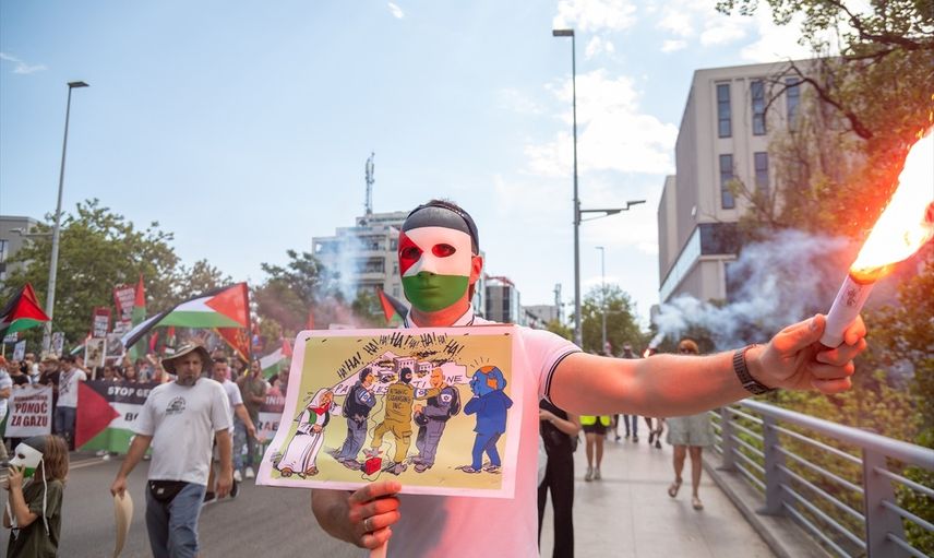 Podgoritsa'da yüzlerce kişi, İsrail'in Gazze'de uyguladığı soykırımın durmasını talep ederek bir araya geldi.