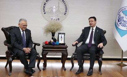 Saadet Partisi Genel Başkanı Mahmut Arıkan (sağda), Kayseri Büyükşehir Belediye Başkanı Memduh Büyükkılıç'ı (solda) makamında ziyaret etti.