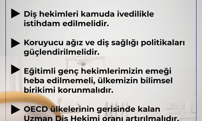 "TÜİK ve OECD verilerine göre, Türkiye’de hanehalkı sağlık harcamalarının yaklaşık yüzde 15’i diş sağlığı hizmetlerinden kaynaklanmakta, bu harcamalar birçok aile için 'katastrofik sağlık harcaması' boyutuna ulaşmaktadır. Koruyucu diş sağlığı hizmetleri yaygınlaştırılsa, bu ekonomik yük ciddi biçimde azaltılabilir. Ağız ve diş sağlığı, yalnızca estetik değil; genel sağlığın ayrılmaz bir parçasıdır. Koruyucu hizmetler ile; birçok sistemik rahatsızlığın görülme sıklığını azaltmak mümkündür. Koruyucu diş sağlığı hizmetleri 4-7 kat maliyet etkin olmakla birlikte, uzman diş hekimi istihdamı ise yaklaşık yüzde 20 oranında tedavi başarısını artırmakta ve uzun vadede aynı oranda sağlık maliyetini azaltmaktadır. MHRS’de en çok randevu alınan branşlardan olan diş hekimliğinin yükü koruyucu ağız ve diş sağlığı hizmetlerine ağırlık verilerek ve diş hekimi ataması yapılarak azaltılmalı, diş hekimlerinin iş yoğunluğu makul seviyelere getirilmeli, hastalara yeteri kadar zaman ayırması sağlanmalıdır."
