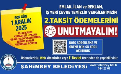 Şahinbey Belediyesi, 2025 yılı Emlak Vergisi, İş Yeri Çevre Temizlik Vergisi ile İlan ve Reklam Vergisi borçlarının ikinci taksit ödemeleri için son tarihin 1 Aralık 2025 Pazartesi olduğunu duyurdu. Belediye, ödemelerin zamanında yapılmaması halinde gecikme ve ceza uygulamalarının devreye gireceğini bildirdi.