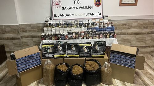 Karasu'da jandarma operasyonunda 30 kg kıyılmış tütün, 66.720 dolu ve 14.000 boş makaron, 290 paket tarihli nargile tütünü ve 10 adet 500 g bandrollü tütün ele geçirildi; 1 şüpheli gözaltında.