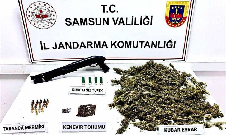 Operasyonda 2 kilo 565 gram kubar esrar, 30 gram kenevir tohumu, ruhsatsız av tüfeği ve 24 fişek ele geçirildi.