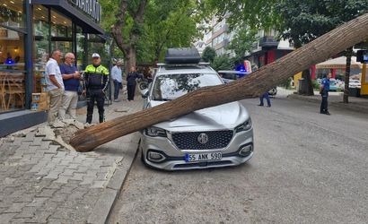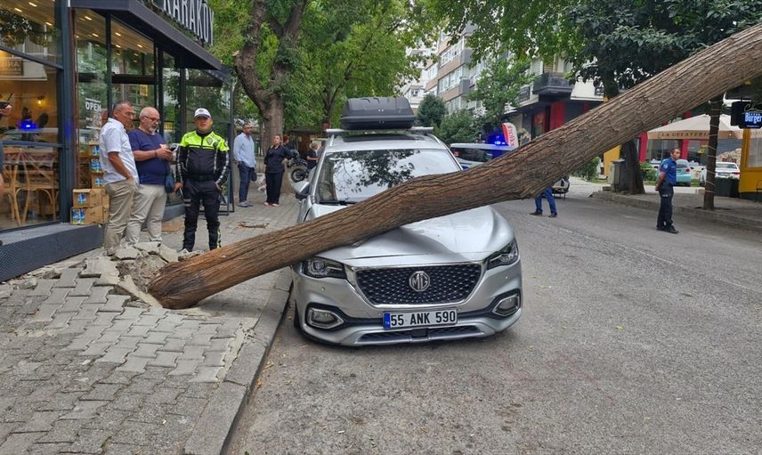 Samsun'un İlkadım ilçesinde kaldırımda bulunan bir ağaç, kökünden koparak park halindeki bir otomobilin üzerine devrildi.